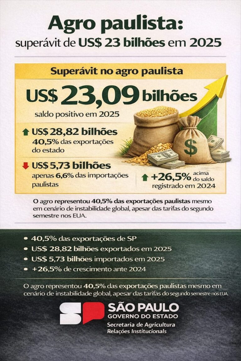 A FORÇA DO AGRO janeiro 12, 2026 Nenhum comentário O Agronegócio paulista encerrou 2025 com superávit de US$ 23,09 bilhões, respondendo por 40,5% de todas as exportações do Estado de São Leia mais »