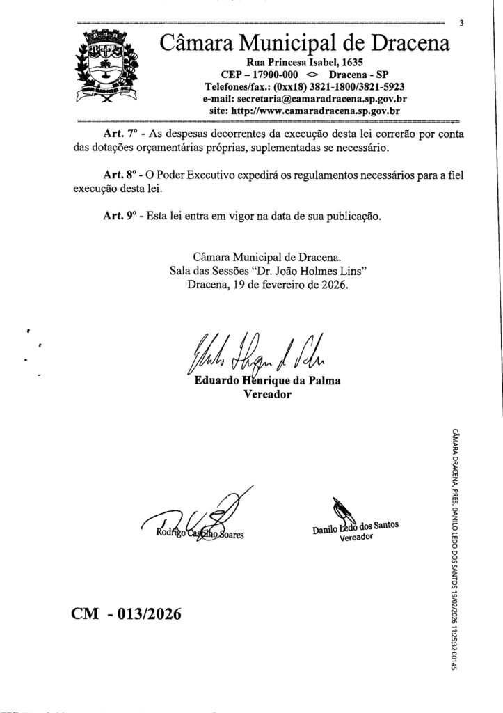 O projeto nº012/2026 é do Vereador Danilo Ledo.