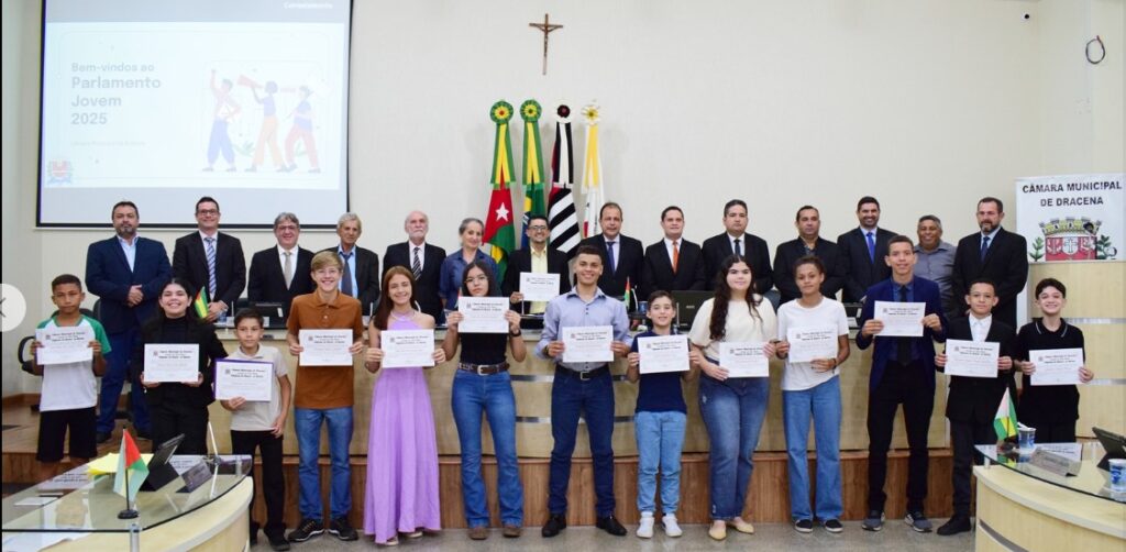 A Câmara Municipal de Dracena realizou, na noite de ontem, segunda-feira, 24 de novembro de 2025, a edição do Parlamento Jovem, projeto que possibilita aos estudantes vivenciar, na prática, o trabalho legislativo e apresentar propostas voltadas ao desenvolvimento da cidade. Excepcionalmente nesta data, a sessão ordinária da Câmara foi realizada às 19h, antecedendo a atividade especial iniciada às 20h.