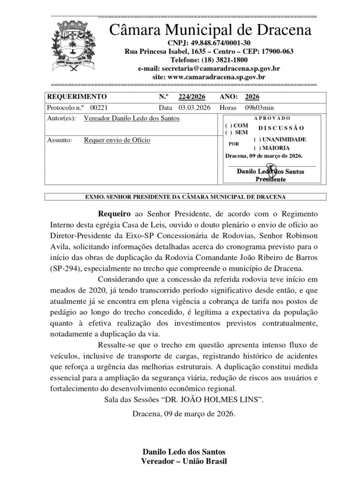+ Requerimento: Obras da Duplicação da Rodovia pela EIXO