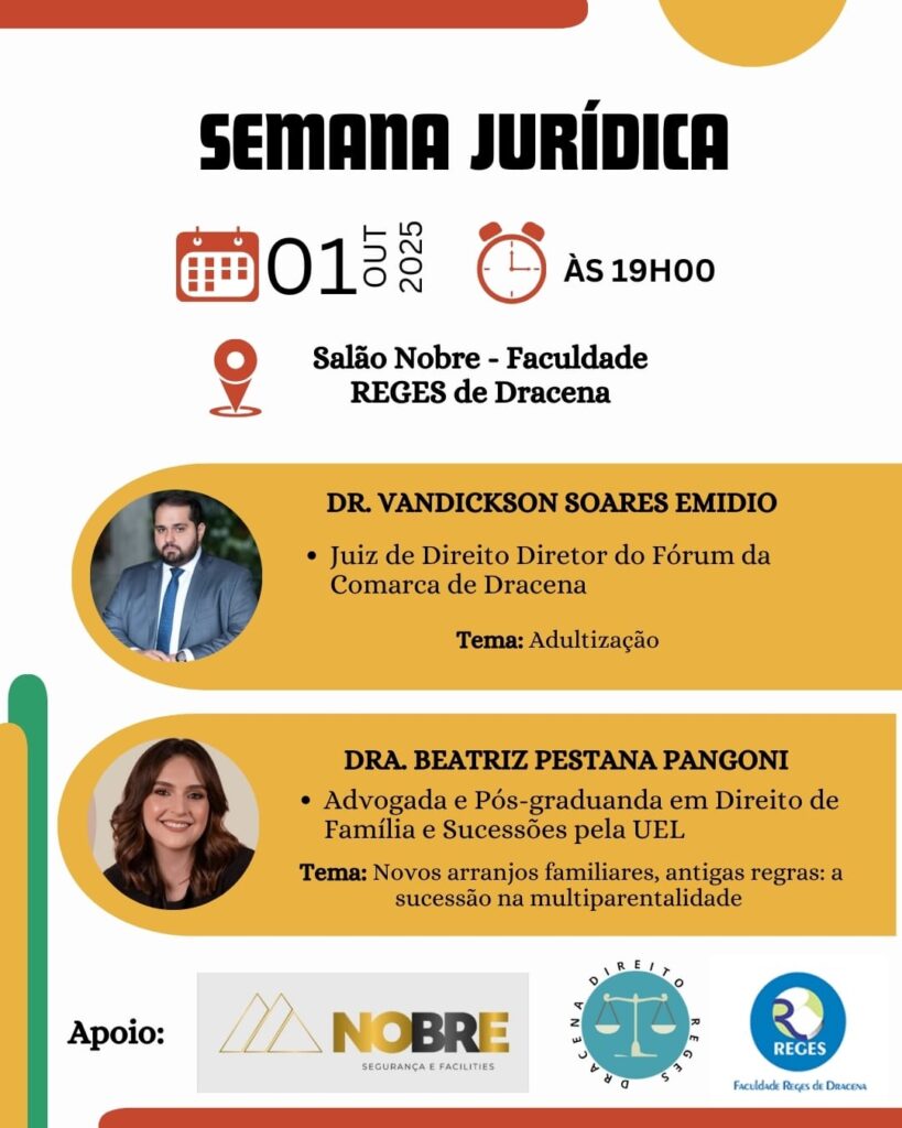 A Faculdade REGES de Dracena realizará nos próximos dias 01,02 e 03 de Outubro a Semana Jurídica. Na primeira noite (01) DR. Vandickson Soares Emidio (Juiz de Direito Diretor do Fórum da Comarca de Dracena), que abordará o tema: Adultização, e também a DRA Beatriz Pestana Pangoni (Advogada e Pós-graduanda em Direito de Família e Sucessões pela UEL) que abordará o tema: Novos Arranjos Familiares, Antigas Regras: A Sucessão na Multiparentalidade.