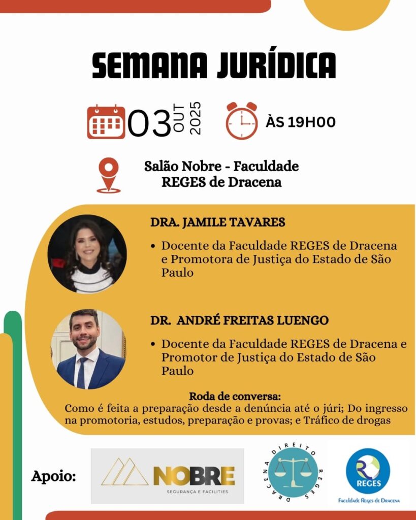 Na noite do dia 03 a DRA Jamile Tavares (Promotora de Justiça do Estado de São Paulo e Docente da Faculdade REGES) e o DR. André Freitas Luengo (Promotor de Justiça do Estado de São Paulo e Docente da Faculdade REGES) participam da Roda de Conversa com o tema: Como é feita a preparação desde a denúncia até o júri, do ingresso na promotoria, estudos, preparação e provas, e Tráfico de Drogas.