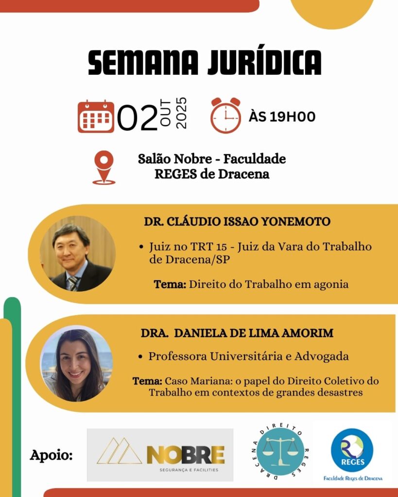 No dia 02 o tema: Direito do Trabalho em Agonia será abordado pelo DR. Cláudio Issao Yonemoto (Juiz no TRT 15 – Juiz da Vara do Trabalho de Dracena, e a DRA. Daniela De Lima Amorim (Professora Universitária e Advogada) que abordará o Tema: Caso Mariana: O Papel Do Direito Coletivo do Trabalho em Contextos de Grandes Desastres.